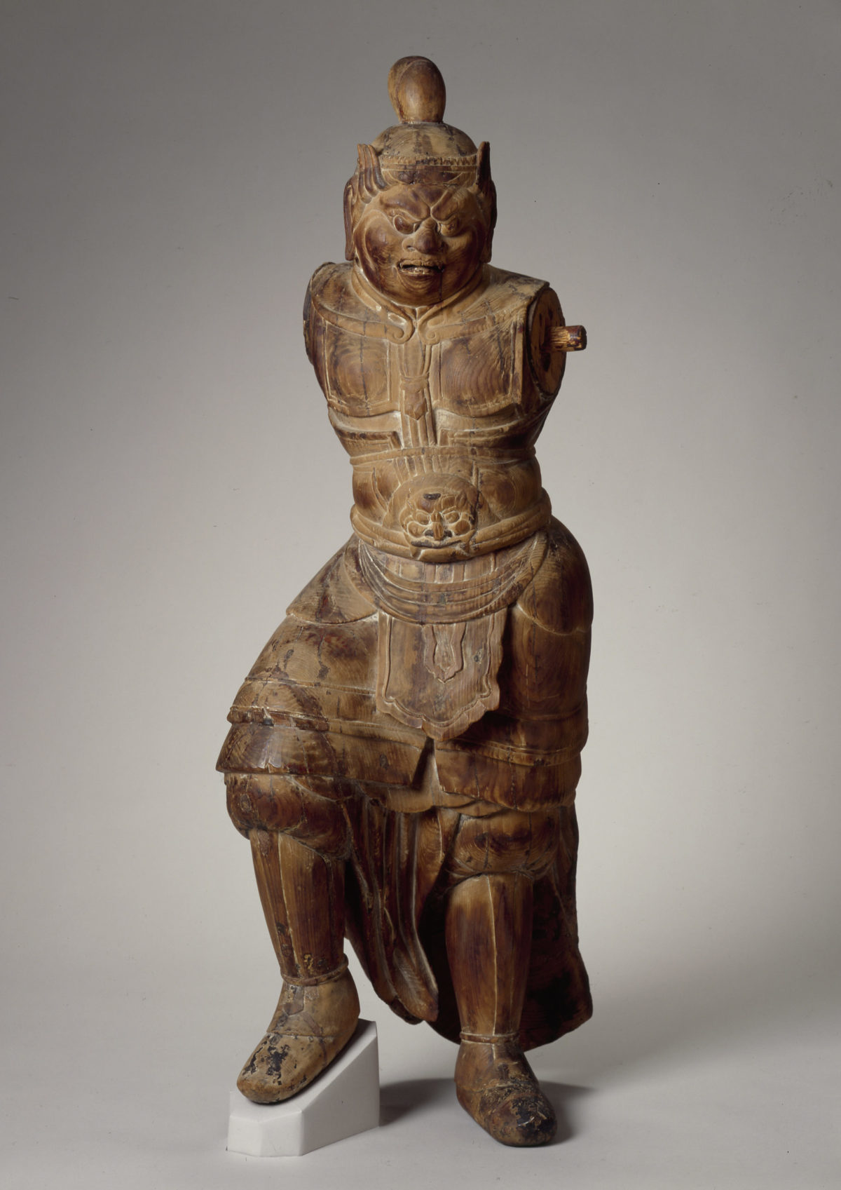 This fierce-looking king is a symbolic protector of the Buddha’s sacred law and also a fighter of evil spirits. His right foot is raised to stamp upon the head of a demon (now missing). His armor consists of tunic, trousers, chest and back plate, and tied sash. A lion’s face decorates the plate at his waist. This figure may be one of the Guardian Kings of the Four Directions, who belong to a large class of Buddhist deities below the level of buddhas and bodhisattvas. The torso of the figure is carved from a single block of wood. Since its arms are missing, we do not know how they were positioned, or what symbolic implements they held. The entire surface was originally smoothed and painted.
