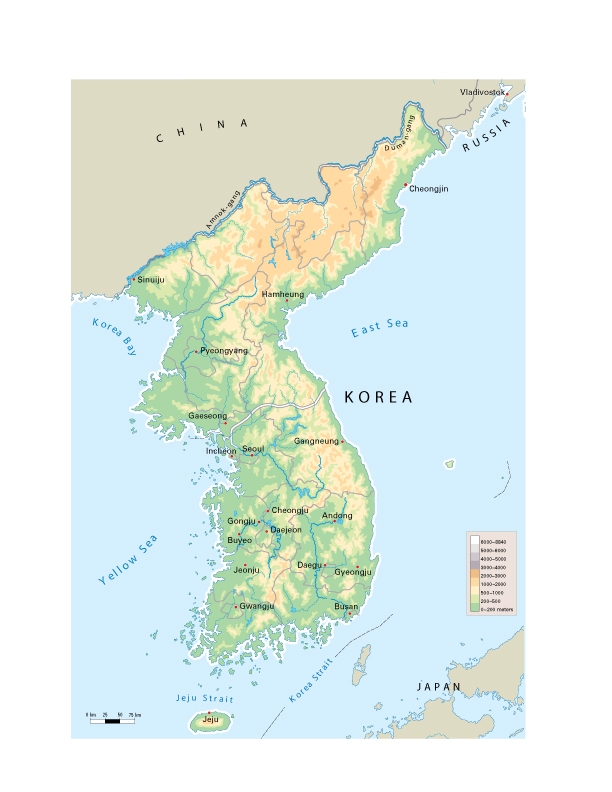 Korea is a mountainous peninsula surrounded by the sea on three sides. It shares its northern borders with China and Russia, and its closest southern neighbor is Japan, which lies across a narrow strait. The Korean peninsula measures approximately six hundred miles from its northern tip to its southern end.