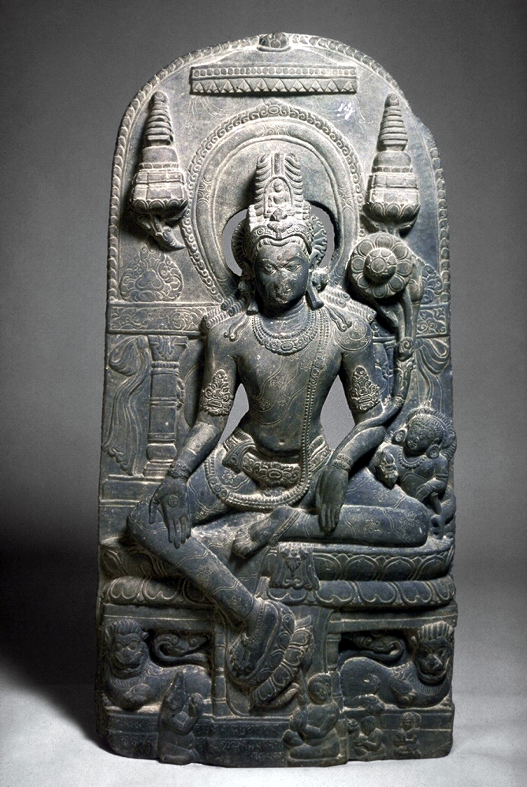 This is an image of the compassionate and merciful bodhisattva Avalokiteshvara. Bodhisattvas are enlightened beings who are destined to become buddhas but postpone that final state in order to help humanity. The name Avalokiteshvara means “Lord who looks down with compassion.” Avalokiteshvara is shown here sitting on a lion throne and arrayed in jewels like a prince. Above his head is a parasol, an ancient symbol of royal status. Beside his head are lotus-borne stupas, topped with sun and crescent moons. Avalokiteshvara’s right hand is in the gesture of gift granting, and in his left hand he holds a long-stemmed lotus. In his elaborate hairdress is an image of the Buddha Amitabha. (Amitabha presides over the western Pure Land, a kind of Buddhist paradise. The worship of Amitabha became very popular in East Asian Buddhism.)