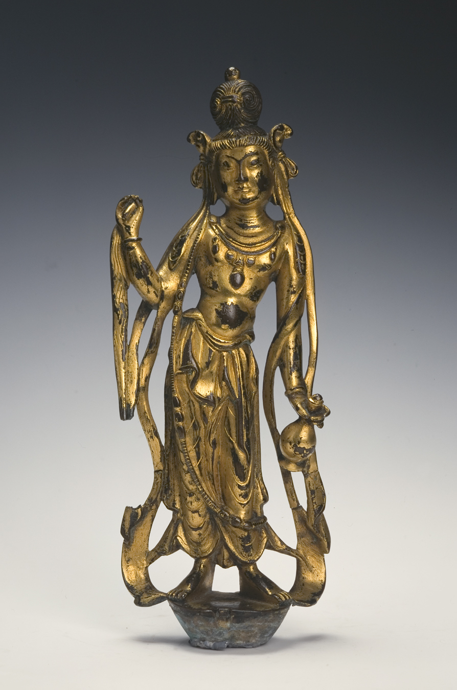 This small bronze statue of Guanyin is slender and curvaceous. The body is portrayed in tribhanga (“S-curve”) position, a style derived from Indian figural sculptures. There is an elaborate coiffure on top of the head. The figure is adorned with long necklaces and jewelry, with a long scarf that hangs down, accentuating the princely and luxurious nature of the image. Standing Guanyin figures often hold a vase in one hand and a lotus flower with the other.