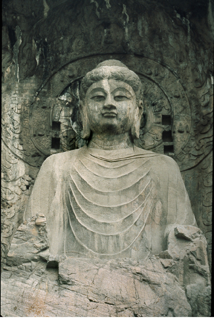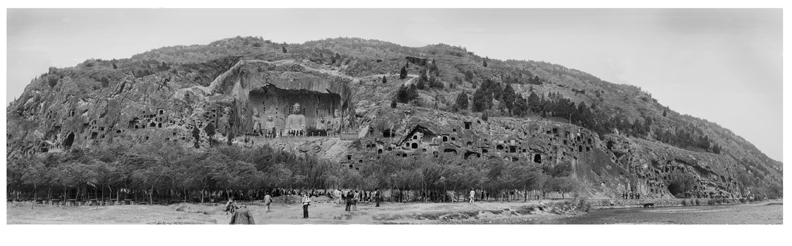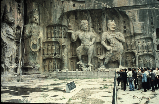 The long horizontal photo shows the expanse of hundreds of caves excavated from the limestone cliffs at a site known as Longmen (Dragon Gates) near the present city of Luoyang. It is now a popular tourist site, and is one of several major Buddhist cave shrine locations where one can see many sculptural art works in their original setting.