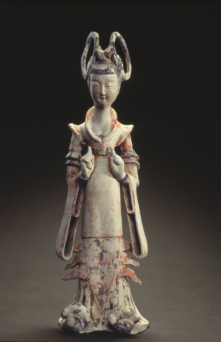 Men and women of the Tang dynasty (618–906) of China were very interested in all things foreign. They often dressed in foreign fashions, and welcomed foreign dance and music at their parties and court entertainments. The single female figure has her hair tied in two large loops. Her upper garment has elaborate winged shoulders and a raised collar leading to a V-shaped front. Her shoes have elaborate, up-turned toes. Her elongated sleeves are representative of the court fashions at that time. This woman is performing what appears to be a sedate dance; however, written descriptions indicate that many such performances were anything but sedate. Fashion changed remarkably quickly during the first century of the Tang dynasty. Notice her large, puffy shoes. The slender, elaborately coiffured woman depicted here would have looked out of place among the plump women of style of the 700s.