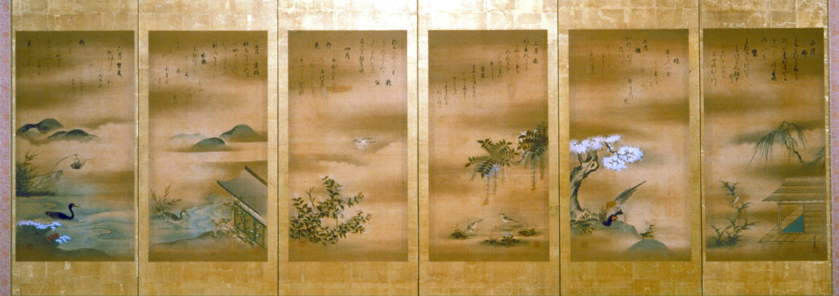The poems on this screen were not written by the painter, but were originally composed by Fujiwara Teika (1167–1241), the foremost poet of the Kamakura period (1185–1333). Teika, a member of the nobility, wrote the “Flowers of Birds of the Twelve Months” in 1214. Some 500 years later, they experienced a renaissance of interest among the disenfranchised courtiers as well as the newly rich merchant class who sought ownership of cultural sophistication. Different styles of writing are represented suggesting it was several calligraphers, perhaps even members of a poetry club who contributed to this work. Only Konoe Iehiro (1667–1736) has been identified as one of the calligraphers.