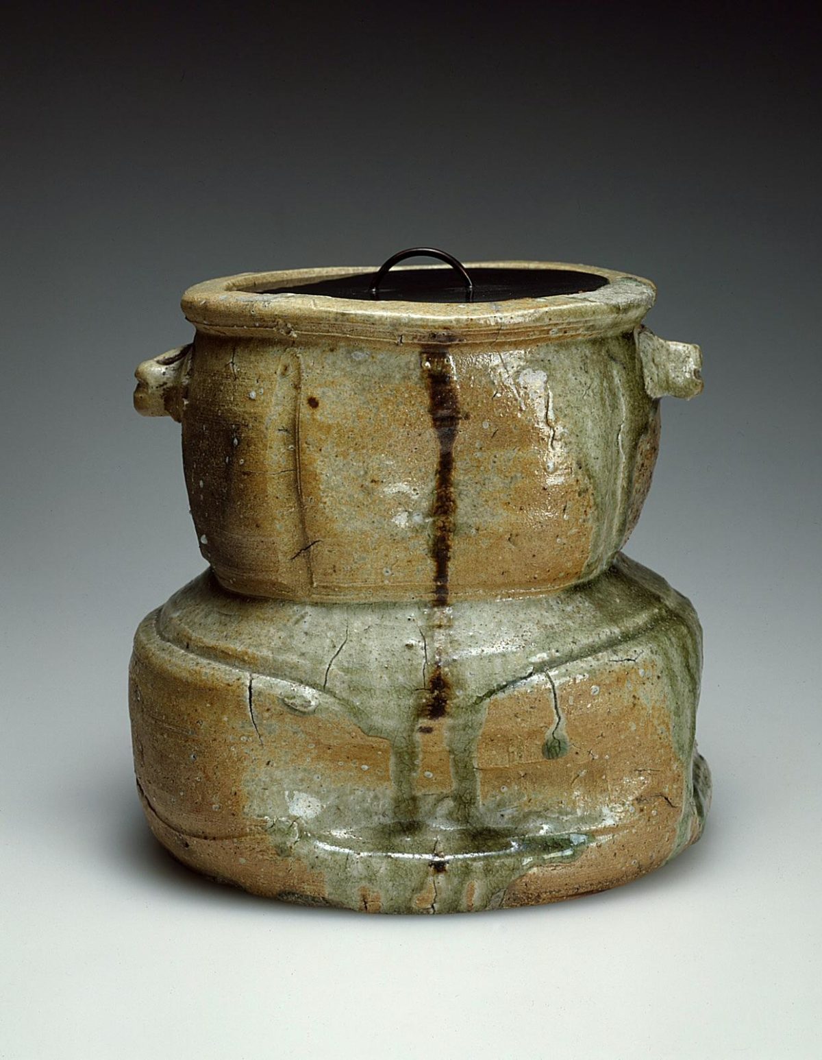 The container is stoneware. The clay is fired in a kiln to about 2300 degrees Fahrenheit, and becomes hard and almost completely watertight. The greenish drips are natural ash glaze—ashes from the wood fire fall onto the piece and because of the high heat are transformed into a glassy substance. This sort of accidental glaze, which is highly desired, is difficult to control and predict. The end result is only seen after the kiln has cooled for a few days, and the artist has removed the vessels. Inevitably some pieces will have cracked, broken, become fused with adjacent pieces, or not turned out as hoped. Do you think the artist was happy with this piece? Why or why not? The lid is a piece of wood shaped to fit the opening and covered with black lacquer, a hard, waterproof coating made from sap of the lacquer tree. Most likely, a different artist specializing in lacquered wood created the lid.
