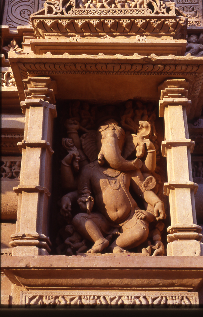The photograph shows the figure of Ganesha in a niche on the side of one of the temples at Khajuraho in central India. There is a similar figure on display in the Asian Art Museum galleries. Many such figures were depicted on the exterior of Hindu temples, as the whole temple was conceived as the abode of the gods, an axial point where humans met the divine. The many-faceted layers of the temple itself were like a palace, where the gods faced out in the various directions. Ganesha is usually found to the left of the entrance to the temple. He is the god of beginnings, and he is the first major image that the devotee sees as he or she circumambulates the temple. Circumambulation, or walking around the central part of the temple in a usually clockwise direction, is an essential part of both Hindu and Buddhist practice.