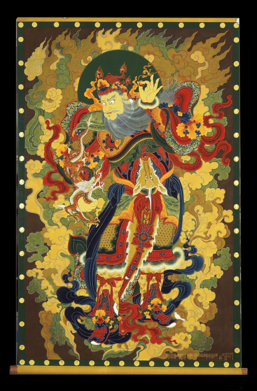 The Buddhist nun Jae-u began this painting in Korea in 2002, hoping to present it to the Asian Art Museum after its move to the new Civic Center location in 2003. She finished the work during her residency at the Museum in autumn of 2003, painting the deity’s eyes last, as is customary. A symbolic “eye-opening” ceremony was held on December 20, 2003.