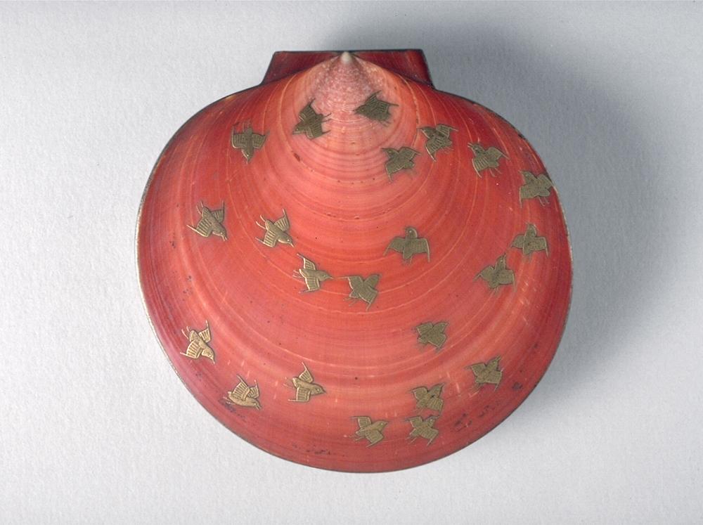 This container is used to hold small chips of incense used in tea gatherings. It is made out of an actual shell, which forms the lid. The base is lacquered wood. The lid is decorated with flying plovers (a small shore bird that runs in and out of the surf while feeding) painted in gold. The sides are decorated with a wave pattern and the inside of the container is also decorated with intricate plants and flowers.